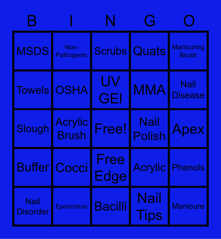 This bingo card has a free space and 46 words: Pedicure, Manicure, Hot oil, Bacilli, Cocci, Spirilla, Non-Pathogenic, Pathogenic, Towels, EPA, OSHA, Quats, Phenols, Acrylic, Monomer, Polymer, UV GEl, Nail Polish, Pure Acetone, Manicuring Brush, Acrylic Brush, Nail Tips, MSDS, MMA, Nail Adhesive, Nail Disease, Nail Disorder, Cuticle, Free Edge, Buffer, Nail Primer, Nail Dehydrator, Tip Cutter, Nail File, Hyponichium, Eponichium, Apex, Metal Implement, Orange Woodstick, Emery Board, Rasp, Scrubs, Slough, Mask, Paraffin Wax and Autoclave.
