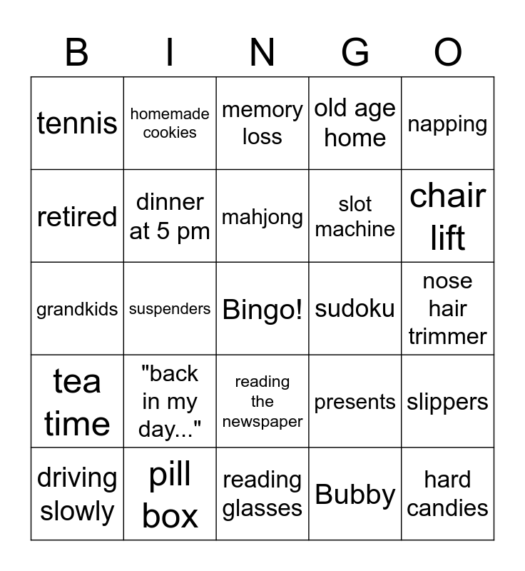 This bingo card has a free space and 34 words: prune juice, Bubby, dentures, lost my hearing aid, tea time, dinner at 5 pm, napping, driving slowly, homemade cookies, vacation village, mahjong, memory loss, zayde, cane, sudoku, chair lift, pill box, grandkids, "back in my day...", presents, reading the newspaper, walker, tennis, nose hair trimmer, reading glasses, hard candies, old age home, bridge club, slot machine, retired, puzzles, suspenders, slippers and vitamins.