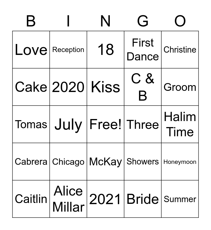 This bingo card has a free space and 29 words: Caitlin, Brett, July, Wedding, Love, 18, 2020, Chicago, Three, Alice Millar, Halim Time, Summer, 2021, Bride, Groom, The Knot, McKay, Cabrera, Christine, Tomas, Showers, Bridesmaids, C & B, Cake, First Dance, Reception, Honeymoon, Kiss and Music.