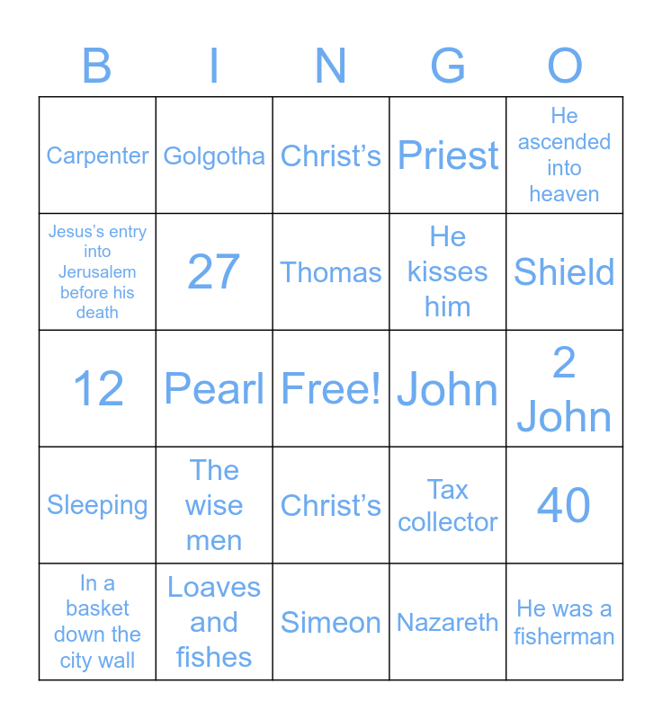 This bingo card has a free space and 24 words: The wise men, Loaves and fishes, Thomas, In a basket down the city wall, He ascended into heaven, Carpenter, Jesus’s entry into Jerusalem before his death, Golgotha, John, Christ’s, He kisses him, 12, Tax collector, 40, 27, Nazareth, 2 John, Christ’s, Shield, Pearl, He was a fisherman, Sleeping, Priest and Simeon.
