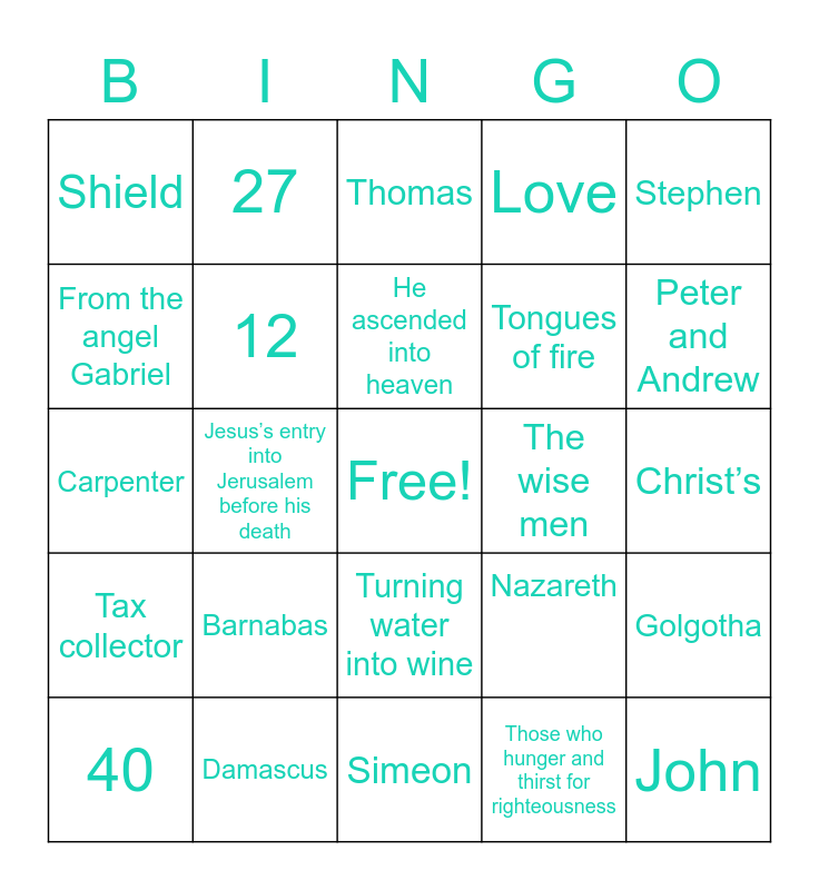 This bingo card has a free space and 24 words: Barnabas, Damascus, He ascended into heaven, 40, Stephen, Shield, From the angel Gabriel, 27, The wise men, Turning water into wine, Tongues of fire, Carpenter, Nazareth, Golgotha, 12, Those who hunger and thirst for righteousness, Christ’s, Thomas, Peter and Andrew, Jesus’s entry into Jerusalem before his death, John, Tax collector, Love and Simeon.