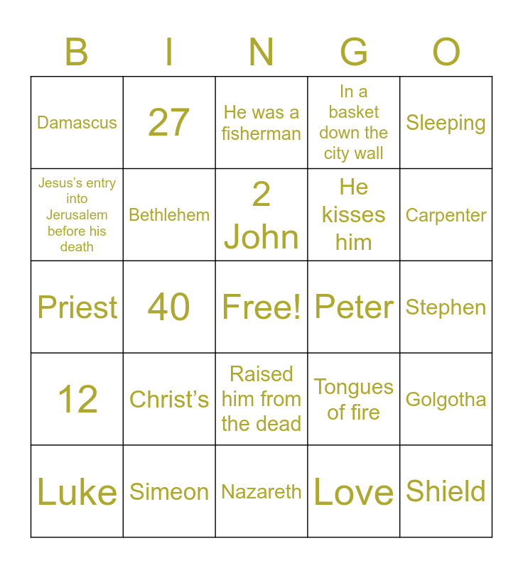 This bingo card has a free space and 24 words: Christ’s, Simeon, 2 John, Luke, Sleeping, Damascus, Jesus’s entry into Jerusalem before his death, 27, Peter, Raised him from the dead, He kisses him, Priest, Tongues of fire, Golgotha, Bethlehem, Love, Stephen, He was a fisherman, Carpenter, 40, Shield, 12, In a basket down the city wall and Nazareth.