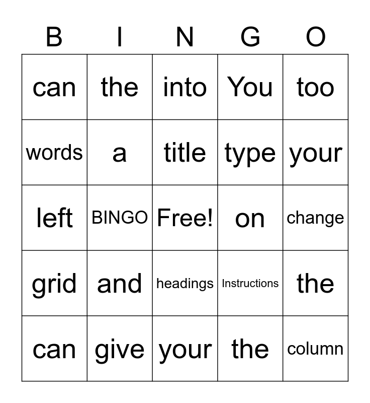 This bingo card has a free space and 27 words: Instructions, Just, type, your, words, into, the, grid, on, the, left, You, can, give, your, game, a, title, and, can, change, the, BINGO, column, headings, too and Then click the Generate button..