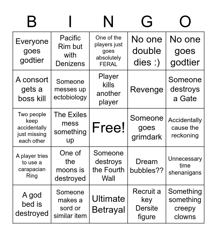 This bingo card has a free space and 24 words: One of the moons is destroyed, Someone makes a sord or similar item, Player kills another player, A god bed is destroyed, No one goes godtier, Everyone goes godtier, A consort gets a boss kill, Pacific Rim but with Denizens, Someone goes grimdark, Someone destroys the Fourth Wall, Revenge, Two people keep accidentally just missing each other, Dream bubbles??, Unnecessary time shenanigans, Someone messes up ectobiology, Recruit a key Dersite figure, Accidentally cause the reckoning, One of the players just goes absolutely FERAL, Someone destroys a Gate, The Exiles mess something up, Something something creepy clowns, A player tries to use a carapacian Ring, No one double dies :) and Ultimate Betrayal.