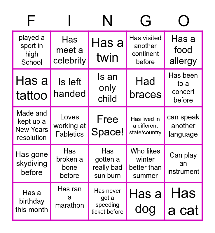 This bingo card has a free space and 24 words: Has a birthday this month, Has broken a bone before, Is an only child, Has a dog, Has a food allergy, played a sport in high School, Has meet a celebrity, Has a twin, Has lived in a different state/country, can speak another language, Made and kept up a New Years resolution, Is left handed, Who likes winter better than summer, Can play an instrument, Has a tattoo, Has ran a marathon, Has never got a speeding ticket before, Has visited another continent before, Has been to a concert before, Has gone skydiving before, Loves working at Fabletics, Has gotten a really bad sun burn, Had braces and Has a cat.
