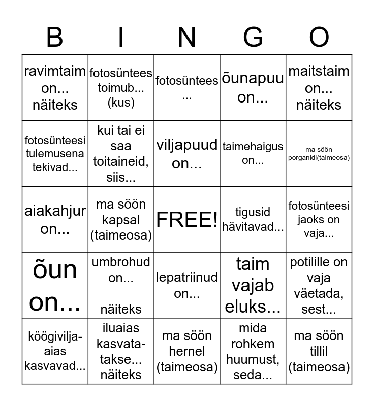 This bingo card has a free space and 24 words: umbrohud on... näiteks, iluaias kasvata-takse... näiteks, viljapuud on..., köögivilja- aias kasvavad..., maitstaim on... näiteks, ravimtaim on... näiteks, fotosünteesi tulemusena tekivad..., fotosüntees toimub...(kus), tigusid hävitavad..., lepatriinud on..., taimehaigus on..., aiakahjur on..., taim vajab eluks..., potilille on vaja väetada, sest..., kui tai ei saa toitaineid, siis..., mida rohkem huumust, seda..., fotosünteesi jaoks on vaja..., fotosüntees ..., ma söön porganidl(taimeosa), ma söön kapsal (taimeosa), ma söön tillil (taimeosa), õun on..., õunapuu on... and ma söön hernel (taimeosa).