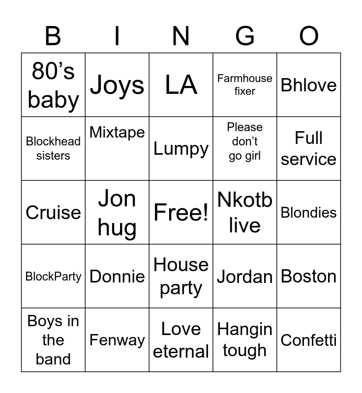 This bingo card has a free space and 34 words: Jon, Hangin tough, tour, Virtual Cruise, BlockParty, Mixtape, Bhlove, Boys in the band, Joys, Whatever night you want it to be, Lumpy, LA, Remix, Joey, Nkotb live, Full service, Fenway, Cruise, Donnie, Jordan, House party, Mask, 80’s baby, Blondies, Love eternal, Confetti, Farmhouse fixer, BBD, Please don’t go girl, Blockhead sisters, I’ll be loving you forever, Jon hug, Boston and Crash.