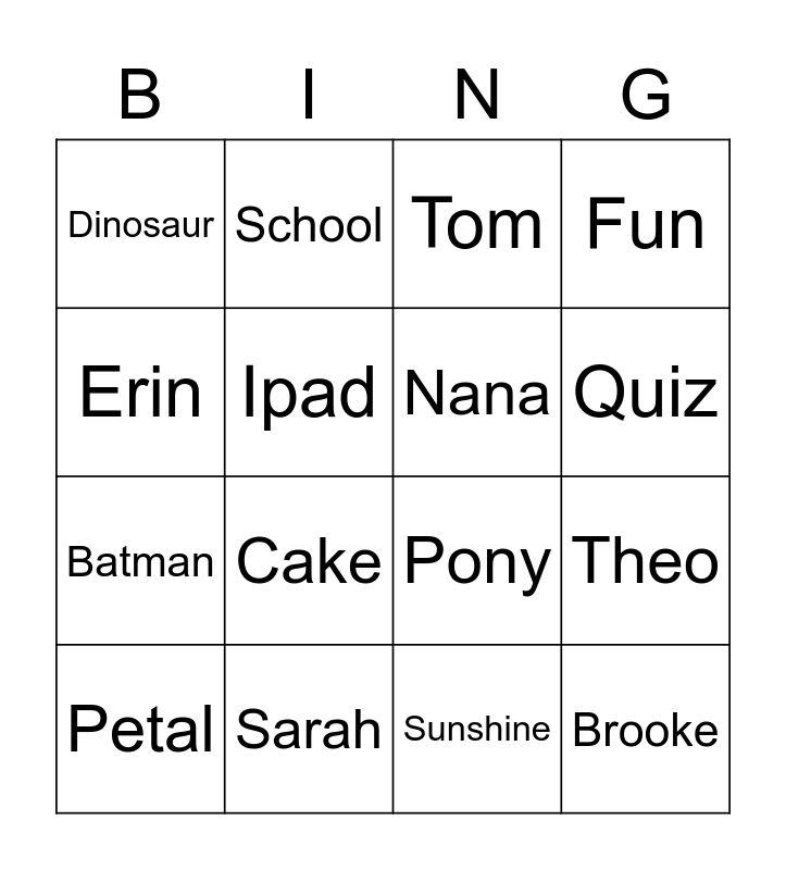 This bingo card has 20 words: Theo, Chantelle, Tom, Izzy, Petal, Erin, Sarah, Dinosaur, Batman, School, Cake, Pony, Ipad, Brooke, Nana, Grandma, Quiz, Fun, Sunshine and Play.