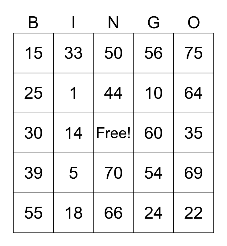 This bingo card has a free space and 24 words: 5, 18, 44, 55, 75, 15, 25, 33, 60, 70, 10, 30, 54, 69, 1, 24, 35, 50, 64, 14, 22, 39, 56 and 66.