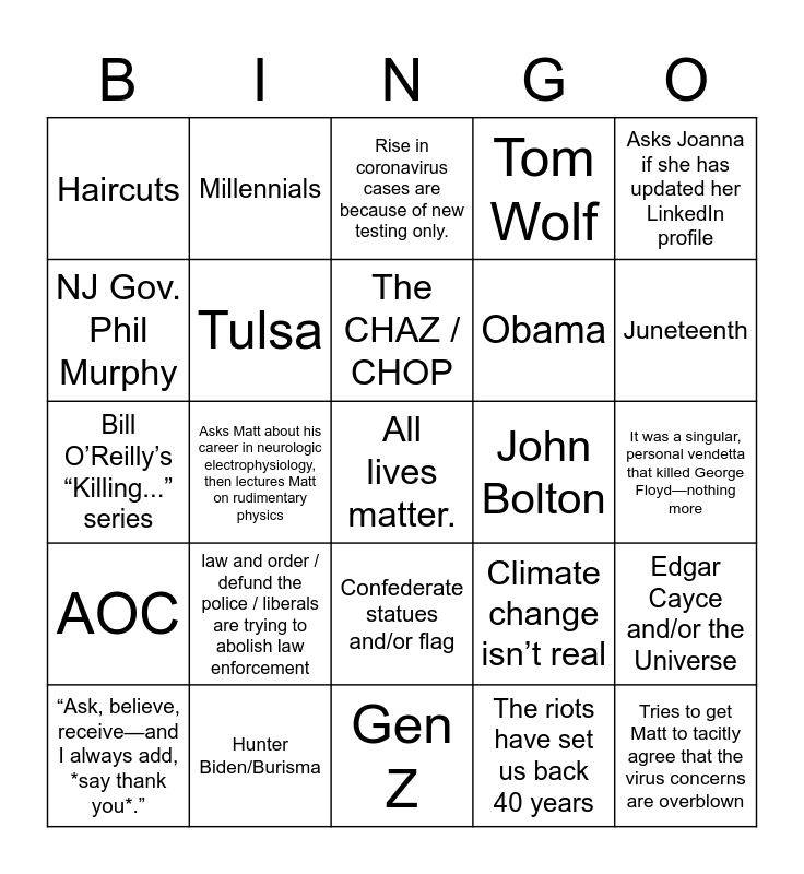 This bingo card has 26 words: Confederate statues and/or flag, The riots have set us back 40 years, The CHAZ / CHOP, Hunter Biden/Burisma, Asks Joanna if she has updated her LinkedIn profile, Haircuts, NJ Gov. Phil Murphy, Millennials, It was a singular, personal vendetta that killed George Floyd—nothing more, Climate change isn’t real, Obama, Bill O’Reilly’s “Killing...” series, Edgar Cayce and/or the Universe, “Ask, believe, receive—and I always add, *say thank you*.”, Asks Matt about his career in neurologic electrophysiology, then lectures Matt on rudimentary physics, Masks, Tom Wolf, AOC, Rise in coronavirus cases are because of new testing only., All lives matter., Juneteenth, Gen Z, John Bolton, law and order / defund the police / liberals are trying to abolish law enforcement, Tulsa and Tries to get Matt to tacitly agree that the virus concerns are overblown.