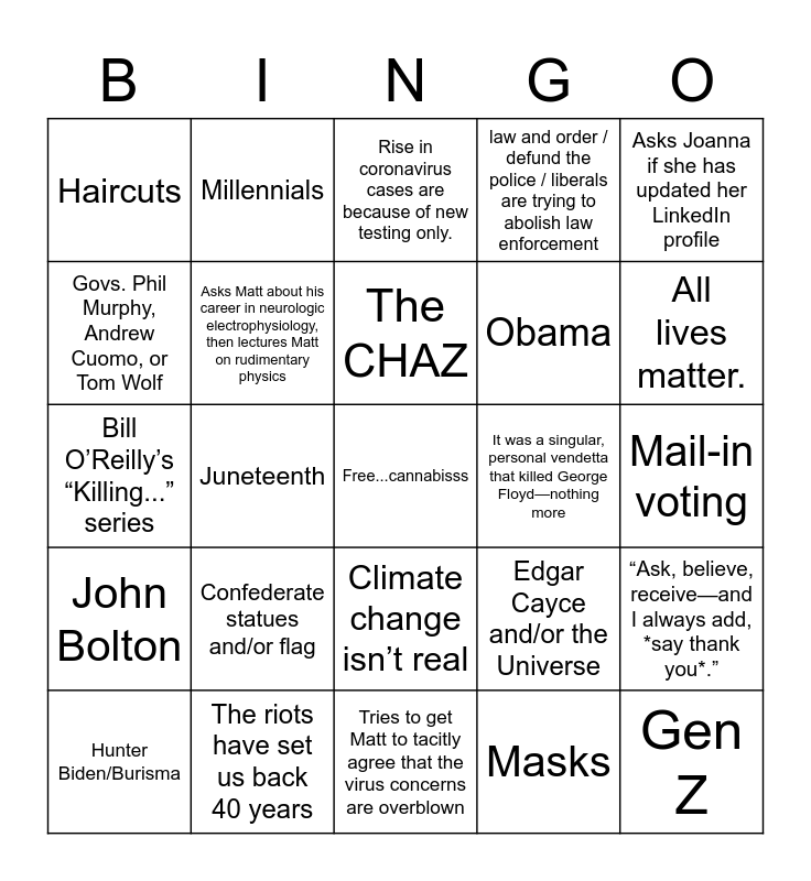 This bingo card has a free space and 24 words: Confederate statues and/or flag, The riots have set us back 40 years, The CHAZ, Hunter Biden/Burisma, Asks Joanna if she has updated her LinkedIn profile, Haircuts, Govs. Phil Murphy, Andrew Cuomo, or Tom Wolf, Millennials, It was a singular, personal vendetta that killed George Floyd—nothing more, Climate change isn’t real, Obama, Bill O’Reilly’s “Killing...” series, Edgar Cayce and/or the Universe, “Ask, believe, receive—and I always add, *say thank you*.”, Asks Matt about his career in neurologic electrophysiology, then lectures Matt on rudimentary physics, Masks, Mail-in voting, Rise in coronavirus cases are because of new testing only., All lives matter., Juneteenth, Gen Z, John Bolton, law and order / defund the police / liberals are trying to abolish law enforcement and Tries to get Matt to tacitly agree that the virus concerns are overblown.