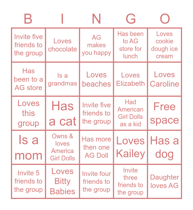 This bingo card has a free space and 24 words: Owns & loves America Girl Dolls, Loves Bitty Babies, Loves beaches, Invite 5 friends to the group, Loves cookie dough ice cream, Invite five friends to the group, Has been to a AG store, Loves chocolate, Had American Girl Dolls as a kid, Has more then one AG Doll, Loves Elizabeth, Loves this group, Loves Kailey, Has a dog, Is a grandmas, Invite three friends to the group, Free space, AG makes you happy, Loves Caroline, Has a cat, Daughter loves AG, Is a mom, Has been to AG store for lunch and Invite four friends to the group.