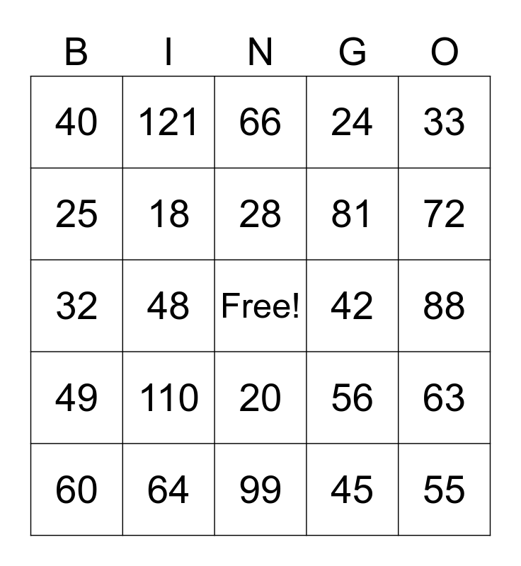 This bingo card has a free space and 35 words: 12, 15, 16, 18, 20, 24, 25, 27, 28, 30, 32, 33, 35, 36, 40, 42, 45, 48, 49, 55, 56, 60, 63, 64, 66, 72, 77, 80, 81, 88, 90, 99, 110, 121 and 144.