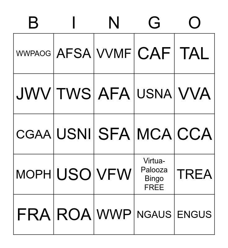This bingo card has 25 words: USO, WWP, AFA, FRA, TAL, WWPAOG, JWV, AFSA, MCA, VFW, USNA, CGAA, Virtua-Palooza Bingo FREE, TREA, TWS, ENGUS, CCA, VVMF, VVA, USNI, SFA, ROA, MOPH, CAF and NGAUS.