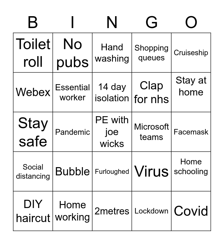 This bingo card has a free space and 24 words: Bubble, Home working, 14 day isolation, DIY haircut, Cruiseship, Toilet roll, Webex, No pubs, Microsoft teams, Furloughed, Clap for nhs, Stay safe, Virus, Home schooling, Essential worker, Lockdown, Facemask, Hand washing, Stay at home, Pandemic, Covid, Social distancing, Shopping queues and 2metres.