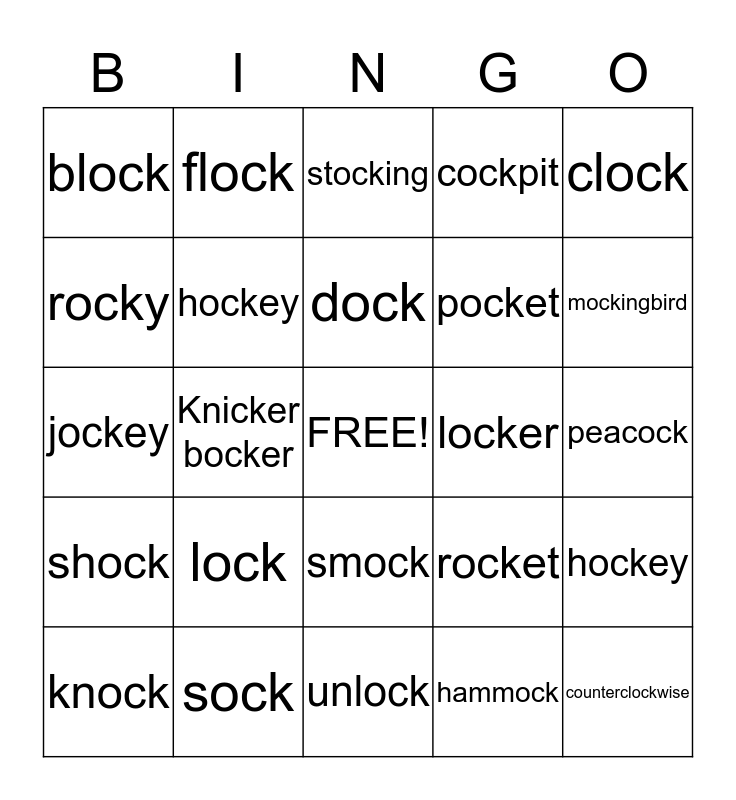 This bingo card has a free space and 24 words: lock, sock, dock, knock, clock, block, rocky, flock, locker, smock, pocket, jockey, rocket, hockey, hockey, hammock, peacock, stocking, mockingbird, Knicker bocker, counterclockwise, shock, cockpit and unlock.