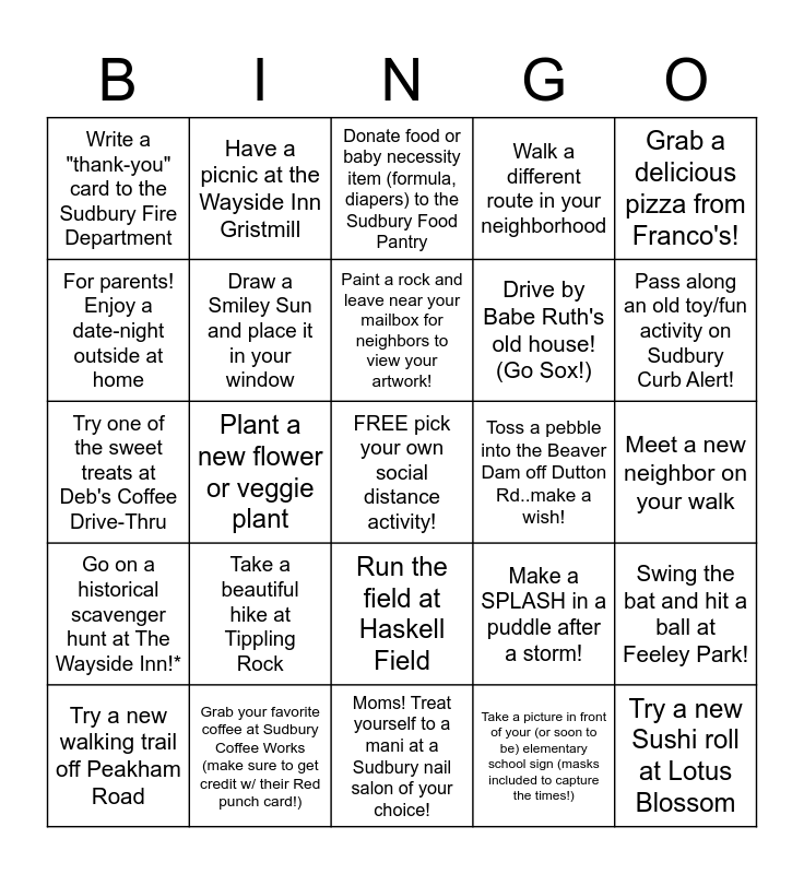 This bingo card has a free space and 24 words: Take a beautiful hike at Tippling Rock, Grab your favorite coffee at Sudbury Coffee Works (make sure to get credit w/ their Red punch card!), Paint a rock and leave near your mailbox for neighbors to view your artwork!, Try a new walking trail off Peakham Road, Grab a delicious pizza from Franco's!, Write a "thank-you" card to the Sudbury Fire Department, For parents! Enjoy a date-night outside at home, Have a picnic at the Wayside Inn Gristmill, Toss a pebble into the Beaver Dam off Dutton Rd..make a wish!, Run the field at Haskell Field, Drive by Babe Ruth's old house! (Go Sox!), Try one of the sweet treats at Deb's Coffee Drive-Thru, Make a SPLASH in a puddle after a storm!, Swing the bat and hit a ball at Feeley Park!, Draw a Smiley Sun and place it in your window, Take a picture in front of your (or soon to be) elementary school sign (masks included to capture the times!), Meet a new neighbor on your walk, Donate food or baby necessity item (formula, diapers) to the Sudbury Food Pantry, Pass along an old toy/fun activity on Sudbury Curb Alert!, Plant a new flower or veggie plant, Try a new Sushi roll at Lotus Blossom, Go on a historical scavenger hunt at The Wayside Inn!*, Walk a different route in your neighborhood and Moms! Treat yourself to a mani at a Sudbury nail salon of your choice!.