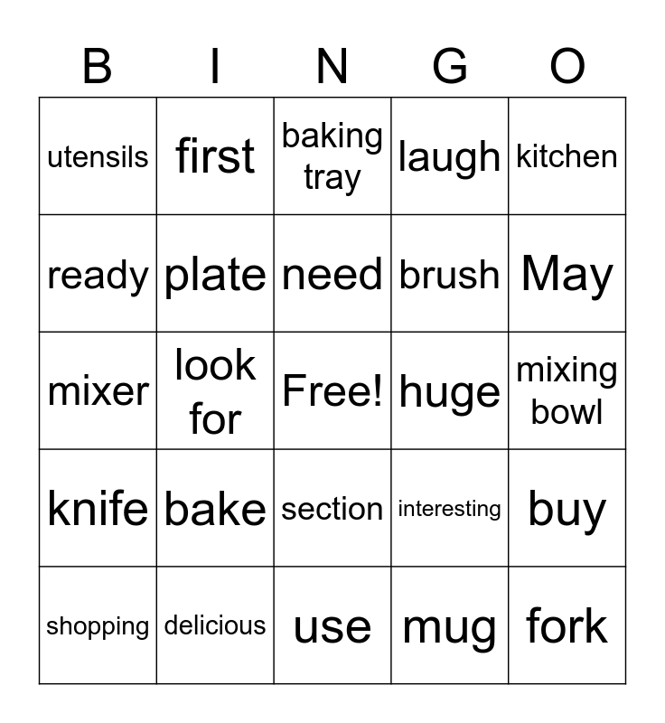 This bingo card has a free space and 24 words: bake, delicious, need, shopping, kitchen, utensils, ready, first, huge, section, brush, mixer, interesting, buy, plate, mug, mixing bowl, baking tray, May, look for, fork, knife, laugh and use.