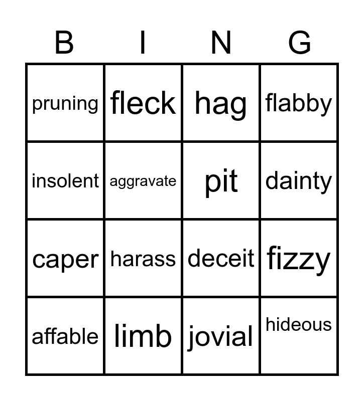 This bingo card has 16 words: limb, fizzy, hag, pruning, caper, fleck, deceit, jovial, insolent, aggravate, affable, flabby, harass, dainty, pit and hideous.