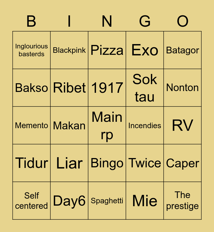 This bingo card has a free space and 24 words: Liar, Day6, 1917, Self centered, Batagor, Inglourious basterds, Bakso, Blackpink, Incendies, Bingo, Sok tau, Memento, Twice, Caper, Ribet, Mie, RV, Pizza, Nonton, Makan, The prestige, Tidur, Exo and Spaghetti.