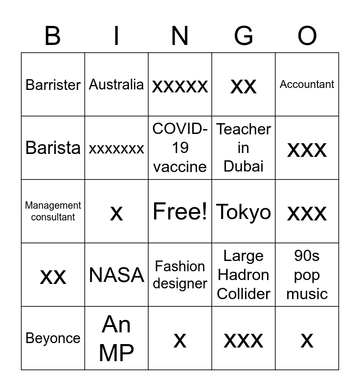 This bingo card has a free space and 24 words: NASA, An MP, COVID-19 vaccine, Beyonce, Accountant, Barrister, Barista, Australia, Tokyo, Fashion designer, Teacher in Dubai, Management consultant, Large Hadron Collider, 90s pop music, xxxxxxx, xxx, xxx, xxxxx, xxx, x, x, xx, xx and x.
