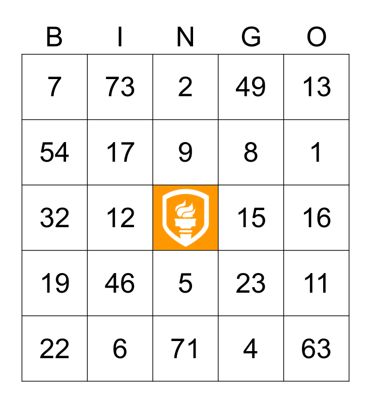 This bingo card has a free space and 24 words: 22, 46, 9, 4, 13, 7, 73, 2, 15, 16, 32, 17, 23, 11, 54, 6, 71, 49, 1, 19, 12, 5, 8 and 63.