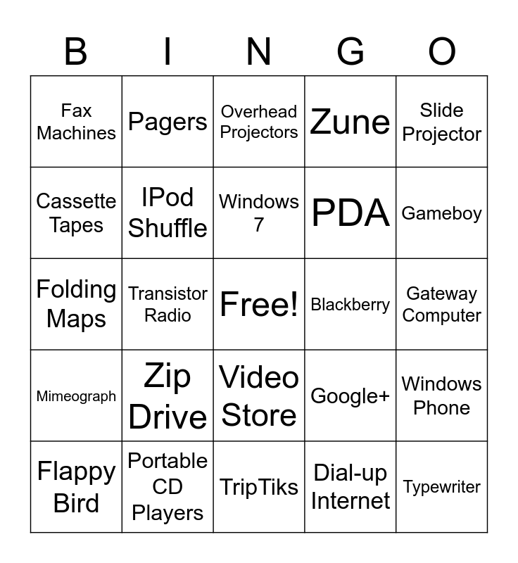 This bingo card has a free space and 53 words: Floppy Disk, Typewriter, VHS Tapes, Dial-up Internet, Zip Drive, Public Pay Phones, Pagers, Dot Matrix Printer, Cassette Tapes, AIM, IPod Shuffle, IPod Nano, Windows Phone, Google+, MySpace, Flappy Bird, Windows 7, Blackberry, Car Phone, Slide Projector, Transistor Radio, Rotary Phones, PDA, Fax Machines, Walkman, Portable CD Players, Atari 2600, Nintendo Entertainment System, N64, Gameboy, Cathode Ray Tube TV, Film Cameras, Film, 8-track Tape, Betamax, Sundial, Zune, TripTiks, Overhead Projectors, Internet Explorer, Flip Phone, Answering Machine, Gateway Computer, Landlines, Slide Ruler, Video Store, Slide Projector, Phone Books, Folding Maps, Mimeograph, Mechanical Calculator, Sega and Garmin GPS.