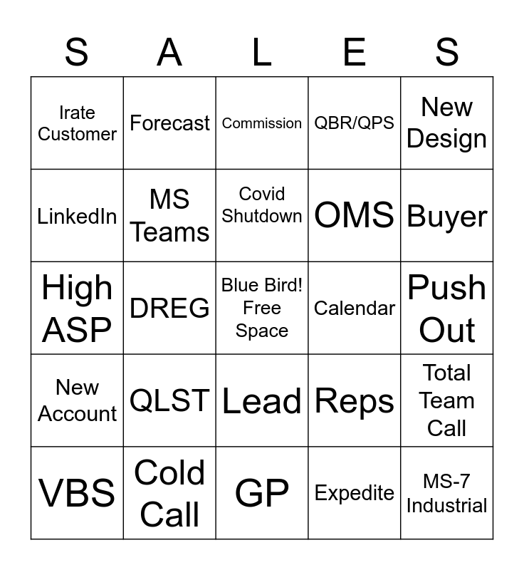 This bingo card has a free space and 30 words: Cold Call, Credit Hold, DREG, Purchase Order, Irate Customer, Commission, MS Teams, Lead, Calendar, GP, Push Out, MS-7 Industrial, Expedite, Nugget/Win, Buyer, CAM, Reps, New Account, QLST, New Design, High ASP, Engineer, Forecast, OMS, LinkedIn, QBR/QPS, Total Team Call, VBS, Covid Shutdown and RFQ.