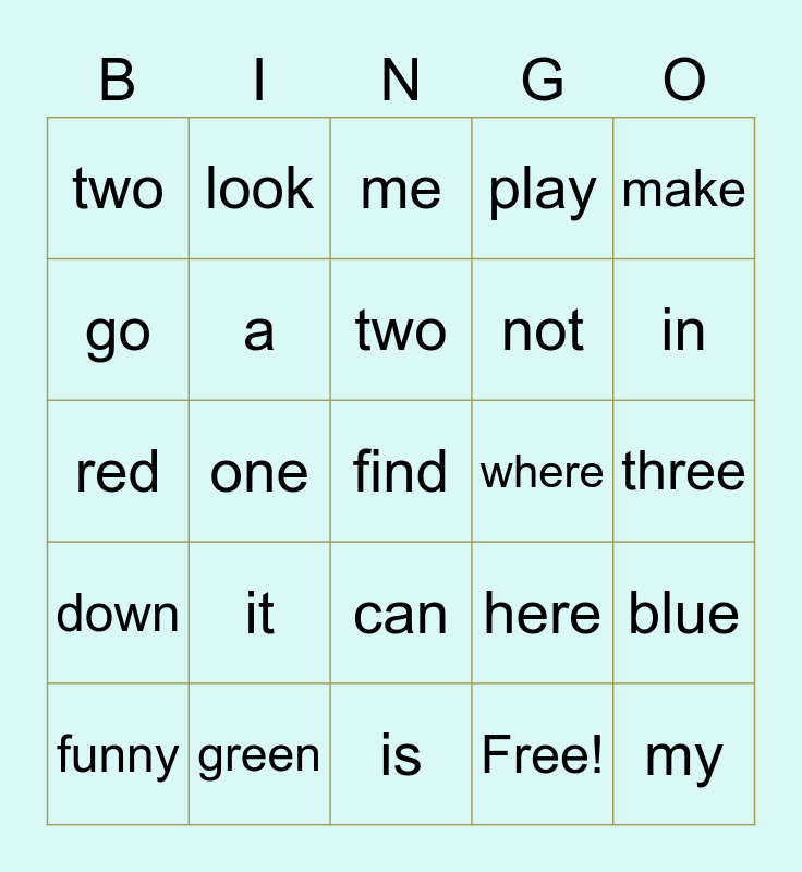 This bingo card has 30 words: green, away, one, up, two, me, a, can, where, is, three, find, Free!, my, in, to, here, down, it, make, red, run, look, not, go, play, blue, funny, two and we.