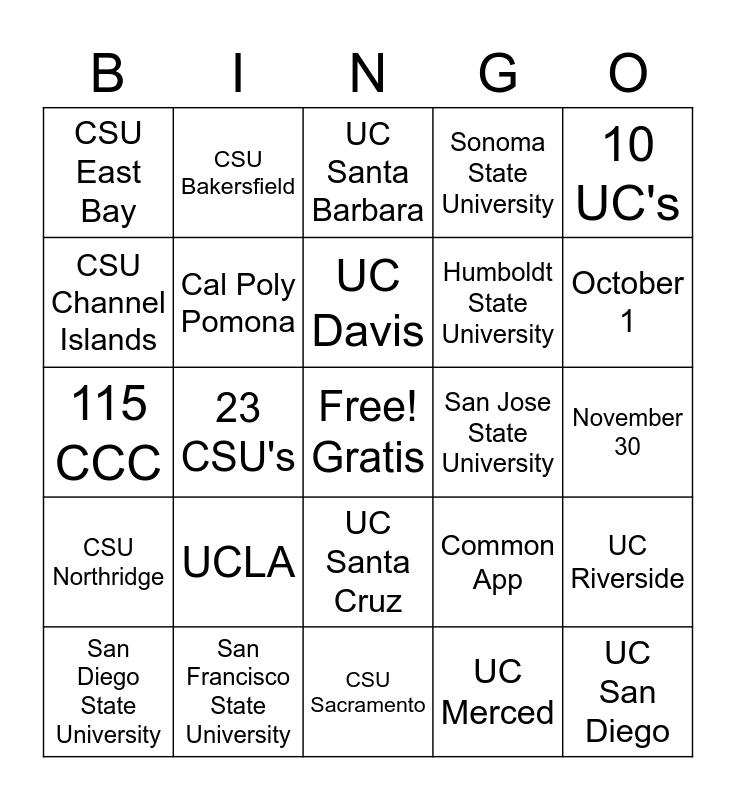 This bingo card has a free space and 42 words: UC Berkeley, UC Davis, UC Irvine, UCLA, UC Merced, UC Riverside, UC San Diego, UC San Francisco, UC Santa Barbara, UC Santa Cruz, November 30, October 1, 23 CSU's, 10 UC's, Private School, Common App, CCC, 115 CCC, August 1, CSU Bakersfield, CSU Channel Islands, CSU Chico, CSU Dominguez Hills, CSU East Bay, CSU Fresno, CSU Fullerton, Humboldt State University, CSU Long Beach, CSU Los Angeles, Cal Maritime Academy, CSU Monterey Bay, CSU Northridge, Cal Poly Pomona, CSU Sacramento, CSU San Bernardino, San Diego State University, San Francisco State University, San Jose State University, Cal Poly San Luis Obispo, CSU San Marcos, Sonoma State University and CSU Stanislaus.
