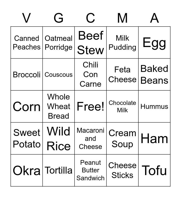 This bingo card has a free space and 75 words: Apple, Bannock, Beef Stew, Cheddar Cheese, Canned Fish, Banana, Chipati, Chicken Curry, Cheese Sticks, Chicken Breast, Berries, Cold Cereal, Chocolate Milk, Baked Beans, Bok Choy, Couscous, Chicken Wrap, Cream Soup, Edamame, Broccoli, Crackers, Chili Con Carne, Feta Cheese, Egg, Canned Peaches, Muffin, Falafel, Flavored Milk, Fish, Carrot, Noodles, Fruit Smoothie, Fortified Soy Beverage, Ham, Corn, Oatmeal Porridge, Grilled Cheese, Kefir, Hummus, Okra, Pita Bread, Hamburger, Milk, Lamb Kebabs, Orange Juice, Polenta, Macaroni and Cheese, Milk Pudding, Lentils, Papaya, Rice, Peanut Butter Sandwich, Paneer, Moose Meat, Peas, Rye Bread, Pizza, Parmesan Cheese, Peanut Butter, Potato, Tortilla, Spaghetti and Meat Sauce, Yogurt, Peanuts in Shells, Salad, Whole Wheat Bread, Stir Fry, Yogurt Drink, Pork Chop, Sweet Potato, Wild Rice, Submarine Sandwich, Yogurt Tubes, Tofu and Sushi.