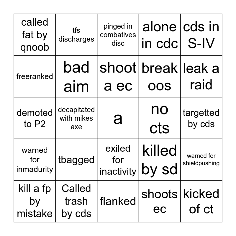 This bingo card has a free space and 24 words: tbagged, Called trash by cds, shoot a ec, kill a fp by mistake, cds in S-IV, called fat by qnoob, freeranked, tfs discharges, no cts, exiled for inactivity, break oos, demoted to P2, killed by sd, warned for shieldpushing, bad aim, shoots ec, targetted by cds, pinged in combatives disc, leak a raid, decapitated with mikes axe, kicked of ct, warned for inmadurity, alone in cdc and flanked.