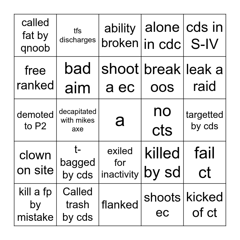 This bingo card has a free space and 24 words: t-bagged by cds, Called trash by cds, shoot a ec, kill a fp by mistake, cds in S-IV, called fat by qnoob, free ranked, tfs discharges, no cts, exiled for inactivity, break oos, demoted to P2, killed by sd, fail ct, bad aim, shoots ec, targetted by cds, ability broken, leak a raid, decapitated with mikes axe, kicked of ct, clown on site, alone in cdc and flanked.