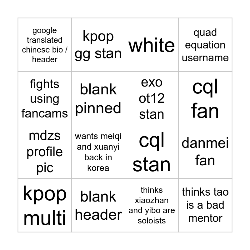 This bingo card has 20 words: danmei fan, wayv is kpop, white, army / moa, kpop multi, fights using fancams, blank header, google translated chinese bio / header, mdzs profile pic, kpop gg stan, wants meiqi and xuanyi back in korea, cql stan, blank pinned, thinks tao is a bad mentor, exo ot12 stan, shipper, cql fan, quad equation username, thinks xiaozhan and yibo are soloists and wayv is kpop.