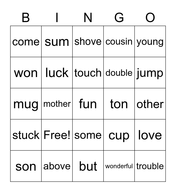 This bingo card has 25 words: Free!, but, touch, son, young, come, won, sum, ton, some, double, mug, cup, love, luck, trouble, other, shove, jump, mother, fun, above, stuck, cousin and wonderful.