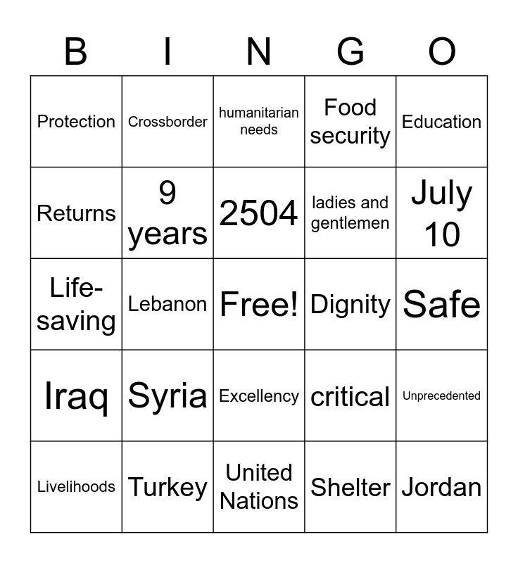This bingo card has a free space and 25 words: Syria, United Nations, 2504, Livelihoods, Education, Protection, Returns, Crossborder, Dignity, Excellency, ladies and gentlemen, Life-saving, critical, Unprecedented, 9 years, $3.8 billion, Safe, humanitarian needs, July 10, Lebanon, Jordan, Turkey, Iraq, Food security and Shelter.