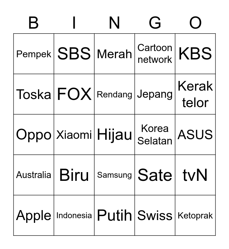 This bingo card has a free space and 24 words: Biru, Indonesia, Rendang, Apple, KBS, Pempek, Toska, SBS, Korea Selatan, Samsung, Jepang, Oppo, Sate, tvN, FOX, Swiss, ASUS, Merah, Kerak telor, Xiaomi, Ketoprak, Australia, Cartoon network and Putih.