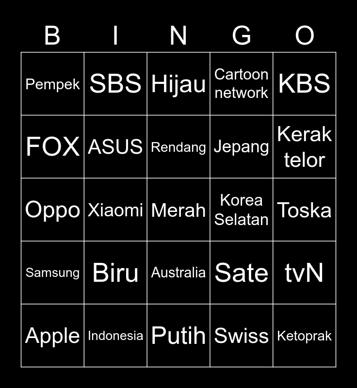 This bingo card has a free space and 24 words: Biru, Indonesia, Rendang, Apple, KBS, Pempek, FOX, SBS, Korea Selatan, Australia, Jepang, Oppo, Sate, tvN, ASUS, Swiss, Toska, Hijau, Kerak telor, Xiaomi, Ketoprak, Samsung, Cartoon network and Putih.
