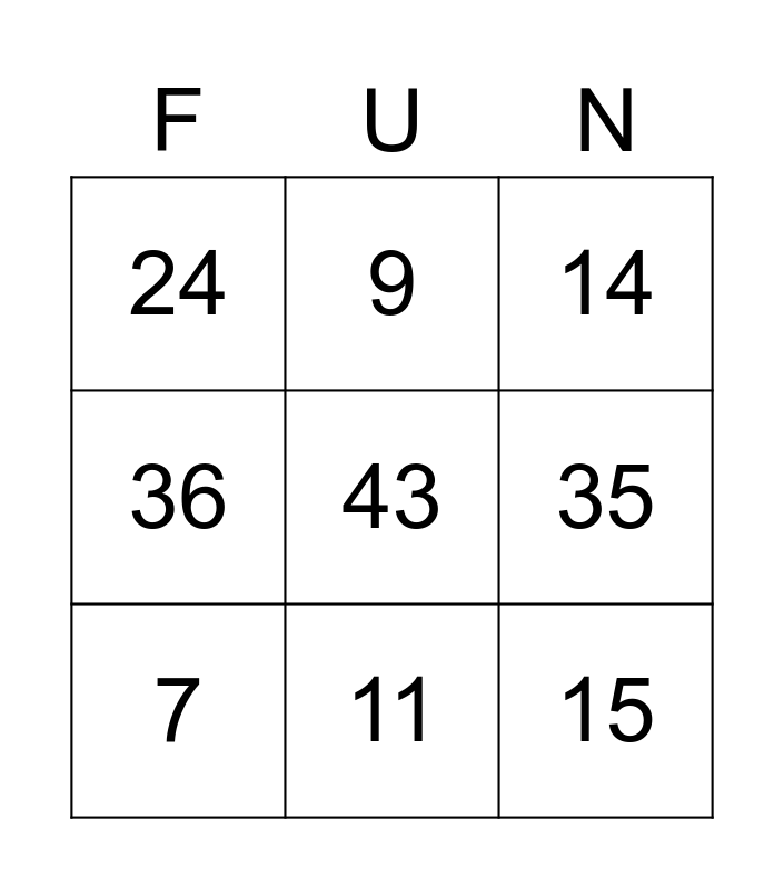 This bingo card has 12 words: 23, 11, 15, 36, 9, 35, 7, 3, 14, 24, 43 and 75.