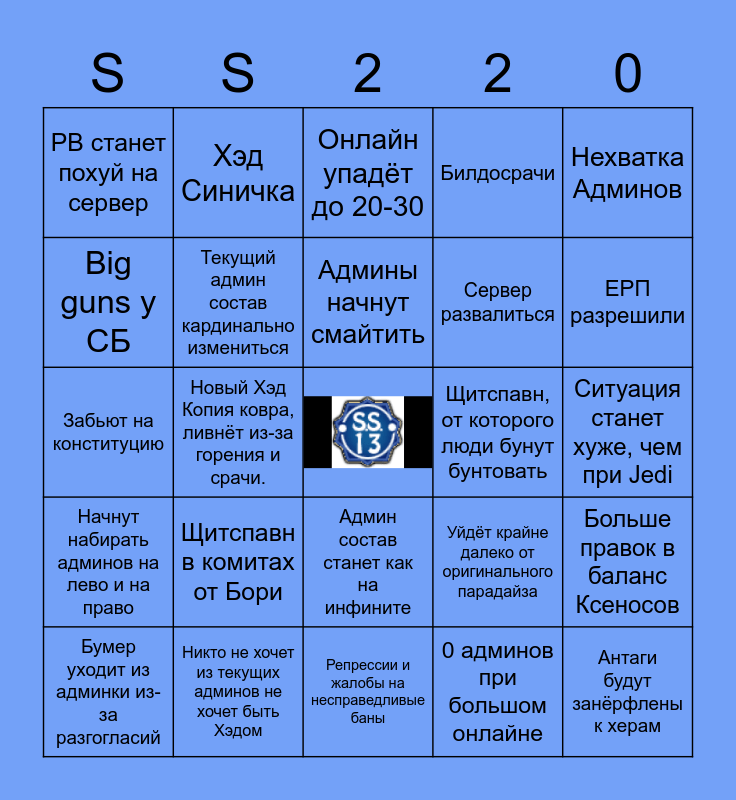 This bingo card has a free space and 24 words: Щитспавн в комитах от Бори, Никто не хочет из текущих админов не хочет быть Хэдом, Админы начнут смайтить, Бумер уходит из админки из-за разгогласий, Нехватка Админов, РВ станет похуй на сервер, Big guns у СБ, Хэд Синичка, Щитспавн, от которого люди бунут бунтовать, Админ состав станет как на инфините, Сервер развалиться, Забьют на конституцию, Уйдёт крайне далеко от оригинального парадайза, Больше правок в баланс Ксеносов, Текущий админ состав кардинально измениться, 0 админов при большом онлайне, Ситуация станет хуже, чем при Jedi, Онлайн упадёт до 20-30, ЕРП разрешили, Новый Хэд Копия ковра, ливнёт из-за горения и срачи., Антаги будут занёрфлены к херам, Начнут набирать админов на лево и на право, Билдосрачи and Репрессии и жалобы на несправедливые баны.