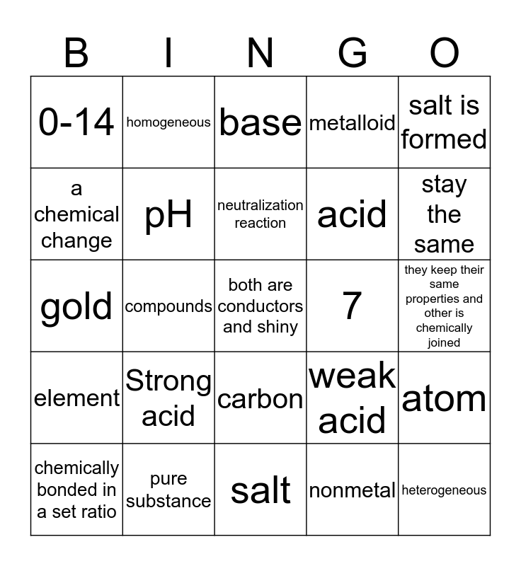 This bingo card has 25 words: Strong acid, salt, neutralization reaction, chemically bonded in a set ratio, salt is formed, 0-14, a chemical change, homogeneous, 7, carbon, acid, gold, weak acid, atom, pH, heterogeneous, they keep their same properties and other is chemically joined, base, stay the same, compounds, both are conductors and shiny, pure substance, element, metalloid and nonmetal.