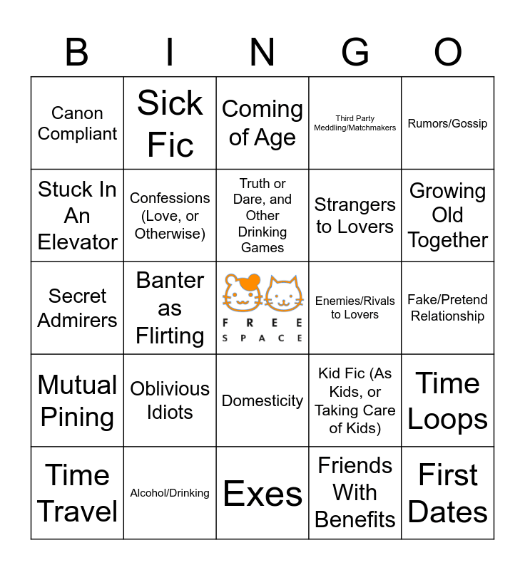 This bingo card has a free space and 30 words: Alcohol/Drinking, And They Were Roommates, Banter as Flirting, Body Swap, Canon Compliant, Coming of Age, Confessions (Love, or Otherwise), Domesticity, Enemies/Rivals to Lovers, Exes, Fake/Pretend Relationship, First Dates, Friends With Benefits, Friends to Lovers, Growing Old Together, Hurt/Comfort, Kid Fic (As Kids, or Taking Care of Kids), Mutual Pining, Oblivious Idiots, Rumors/Gossip, Secret Admirers, Secret Relationship, Sick Fic, Strangers to Lovers, Stuck In An Elevator, Third Party Meddling/Matchmakers, Time Loops, Time Travel, Truth or Dare, and Other Drinking Games and Wing Fic.