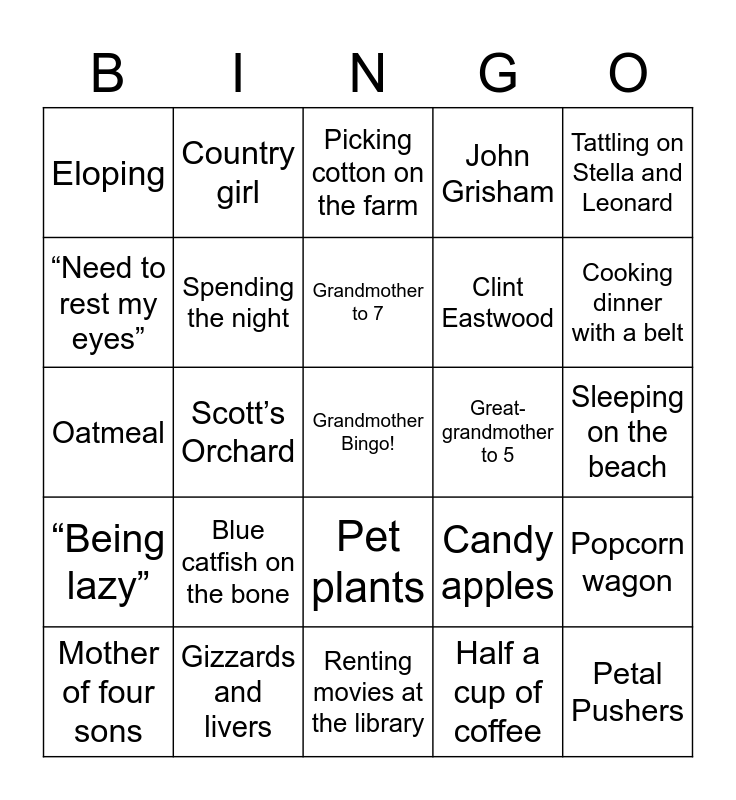This bingo card has 53 words: Free!, Grandmother Bingo!, Bubble bath, Half a cup of coffee, Blue catfish on the bone, Pineapple and mayonnaise sandwiches, Country girl, Granddaddy, “Need to rest my eyes”, Fried bologna sandwich, Spending the night, Clyburne Street, Popcorn wagon, Candy apples, Puerto Rico, Mother of four sons, Grandmother to 7, Great-grandmother to 5, Maroon Thunderbird, Tattling on Stella and Leonard, Scott’s Orchard, Petal Pushers, Clint Eastwood, Eloping, Cull peaches, Gizzards and livers, Sage dressing, “Always offer company coffee”, Minnow swim badge, Cooking dinner with a belt, Sears, Avon, Sam’s Club Coke, Chex mix, Lifetime movies, Steak n’ Shake, John Grisham, Renting movies at the library, Picking cotton on the farm, Macaroni and cheese, Sharp cheddar cheese, Raggedy Ann and Andy, Sleeping on the beach, Popeye's biscuit, Lunch buffet, Pet plants, Miss Alby, Banana split, Oatmeal, “Being lazy”, Fruitcake cookies, "Taste of it" and Orange slices.