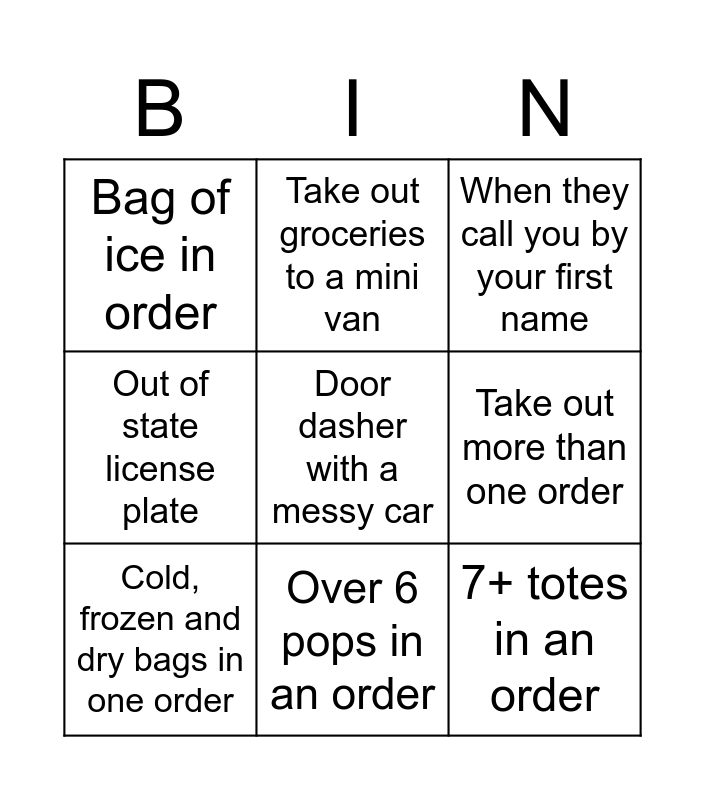 This bingo card has a free space and 14 words: Dog in car, Coins as a tip, Cold, frozen and dry bags in one order, Take out groceries to a mini van, Out of state license plate, 7+ totes in an order, Bag of ice in an order, Someone stands outside of their car with you, Over 6 pops in an order, Bag of ice in order, If you get your tip in an envelope, Take out more than one order, When they call you by your first name and Customer loads own car.