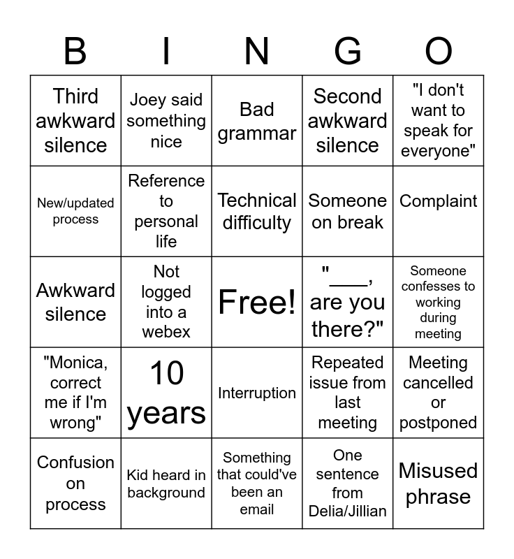 This bingo card has a free space and 24 words: 10 years, Kid heard in background, Technical difficulty, Confusion on process, "I don't want to speak for everyone", Third awkward silence, New/updated process, Joey said something nice, "___, are you there?", Interruption, Someone on break, Awkward silence, Repeated issue from last meeting, Meeting cancelled or postponed, Reference to personal life, One sentence from Delia/Jillian, Someone confesses to working during meeting, Bad grammar, Complaint, Not logged into a webex, Misused phrase, "Monica, correct me if I'm wrong", Second awkward silence and Something that could've been an email.