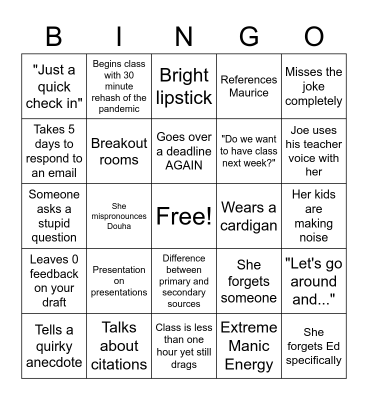 This bingo card has a free space and 24 words: Presentation on presentations, Talks about citations, Goes over a deadline AGAIN, Tells a quirky anecdote, Misses the joke completely, "Just a quick check in", Takes 5 days to respond to an email, Begins class with 30 minute rehash of the pandemic, Wears a cardigan, Difference between primary and secondary sources, "Do we want to have class next week?", Someone asks a stupid question, She forgets someone, "Let's go around and...", Breakout rooms, Extreme Manic Energy, Her kids are making noise, Bright lipstick, Joe uses his teacher voice with her, She mispronounces Douha, She forgets Ed specifically, Leaves 0 feedback on your draft, References Maurice and Class is less than one hour yet still drags.