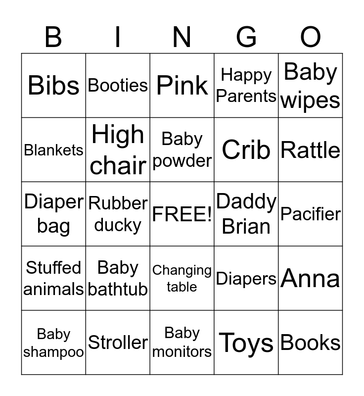 This bingo card has a free space and 25 words: Baby bathtub, Baby monitors, Baby powder, Baby shampoo, Baby wipes, Bibs, Blankets, Booties, Daddy Brian, Changing table, Crib, Diaper bag, Diapers, Anna, High chair, Mommy Val, Pacifier, Pink, Rattle, Rubber ducky, Books, Stroller, Stuffed animals, Happy Parents and Toys.