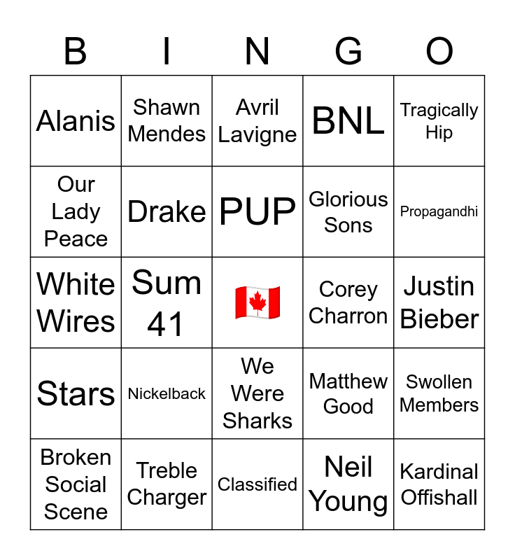 This bingo card has a free space and 24 words: Nickelback, Treble Charger, PUP, Broken Social Scene, Tragically Hip, Alanis, Our Lady Peace, Shawn Mendes, Corey Charron, We Were Sharks, Glorious Sons, White Wires, Matthew Good, Swollen Members, Drake, Neil Young, Justin Bieber, Avril Lavigne, Propagandhi, Sum 41, Kardinal Offishall, Stars, BNL and Classified.