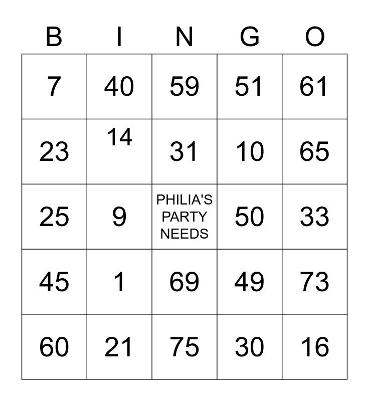 This bingo card has a free space and 24 words: 1, 21, 31, 60, 61, 7, 23, 40, 50, 69, 10, 25, 49, 73, 14, 30, 33, 59, 65, 9, 16, 45, 51 and 75.