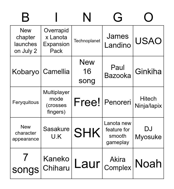 This bingo card has a free space and 24 words: Sasakure U.K, Kaneko Chiharu, New 16 song, 7 songs, USAO, New chapter launches on July 2, Kobaryo, Overrapid x Lanota Expansion Pack, Penoreri, SHK, Paul Bazooka, Feryquitous, Lanota new feature for smooth gameplay, DJ Myosuke, Camellia, Akira Complex, Hitech Ninja/lapix, Technoplanet, Ginkiha, Multiplayer mode (crosses fingers), Noah, New character appearance, James Landino and Laur.